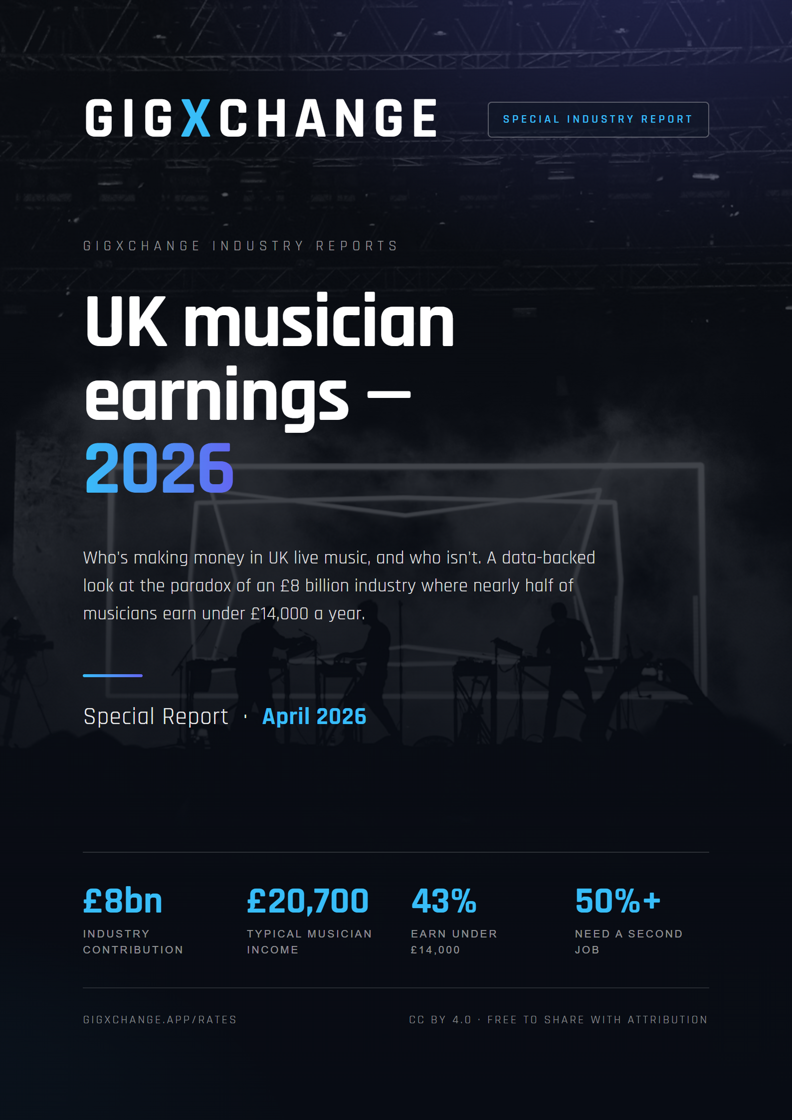 Most UK musician-pay content is either one trade-body press release (UK Music, MU) or one survey finding (Help Musicians) reported in isolation. This report consolidates every mainstream UK source — UK Music, Help Musicians' Musicians' Census, the Musicians' Union, Equity, Glassdoor UK, Indeed UK, Salary Expert, The Guardian, Evening Standard, ONS, Music Venue Trust — into one honest, cross-referenced picture. Free under CC BY 4.0.