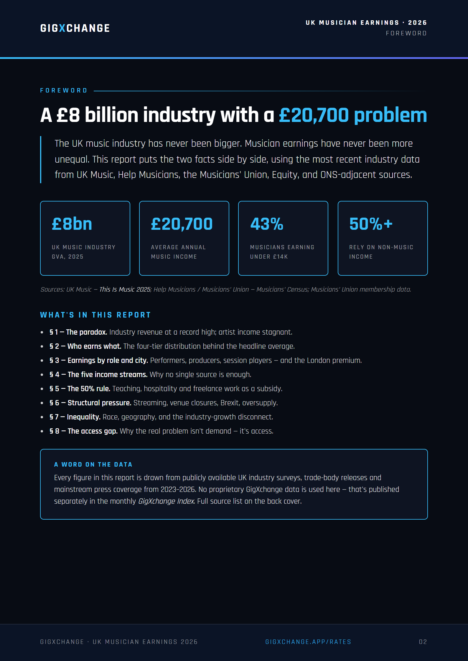 The UK music industry is worth around £8 billion a year. Streaming is at a record high, live has bounced past pre-pandemic levels, and UK music exports are a national success story. Against that backdrop, the average working musician earns £20,700 a year; the bottom 43% earn under £14,000; and more than half need a second job. This report joins the dots, sourced entirely from publicly available UK industry data.